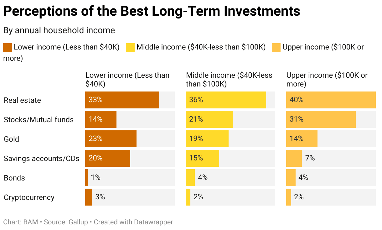 According to a recent Gallup poll, 36% of Americans believe real estate is the best long-term investment, outpacing stocks (22%), gold (18%), savings accounts (13%), bonds (4%) and cryptocurrencies (3%).