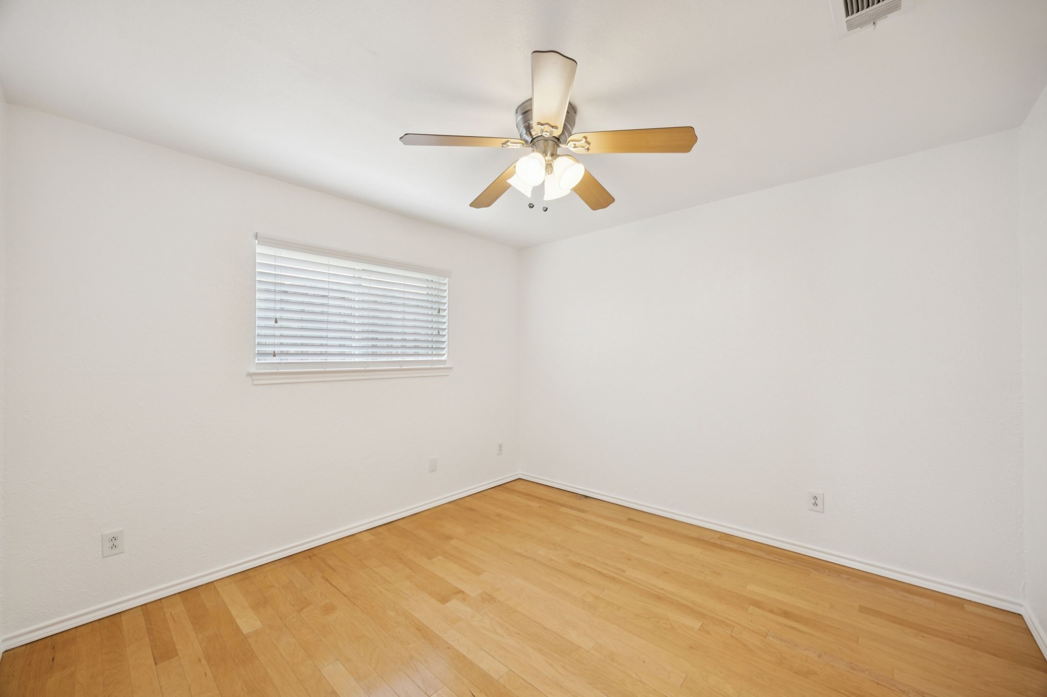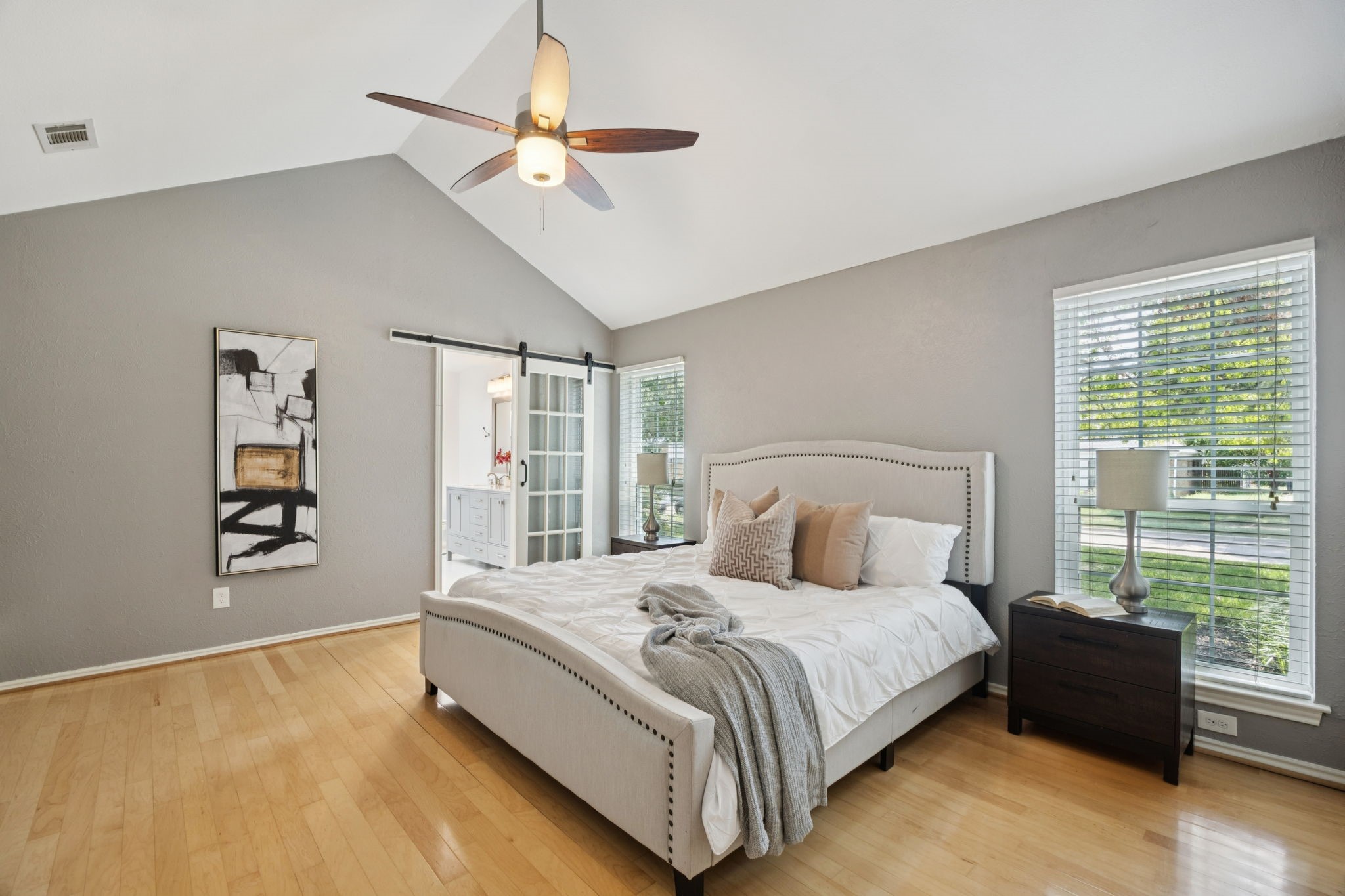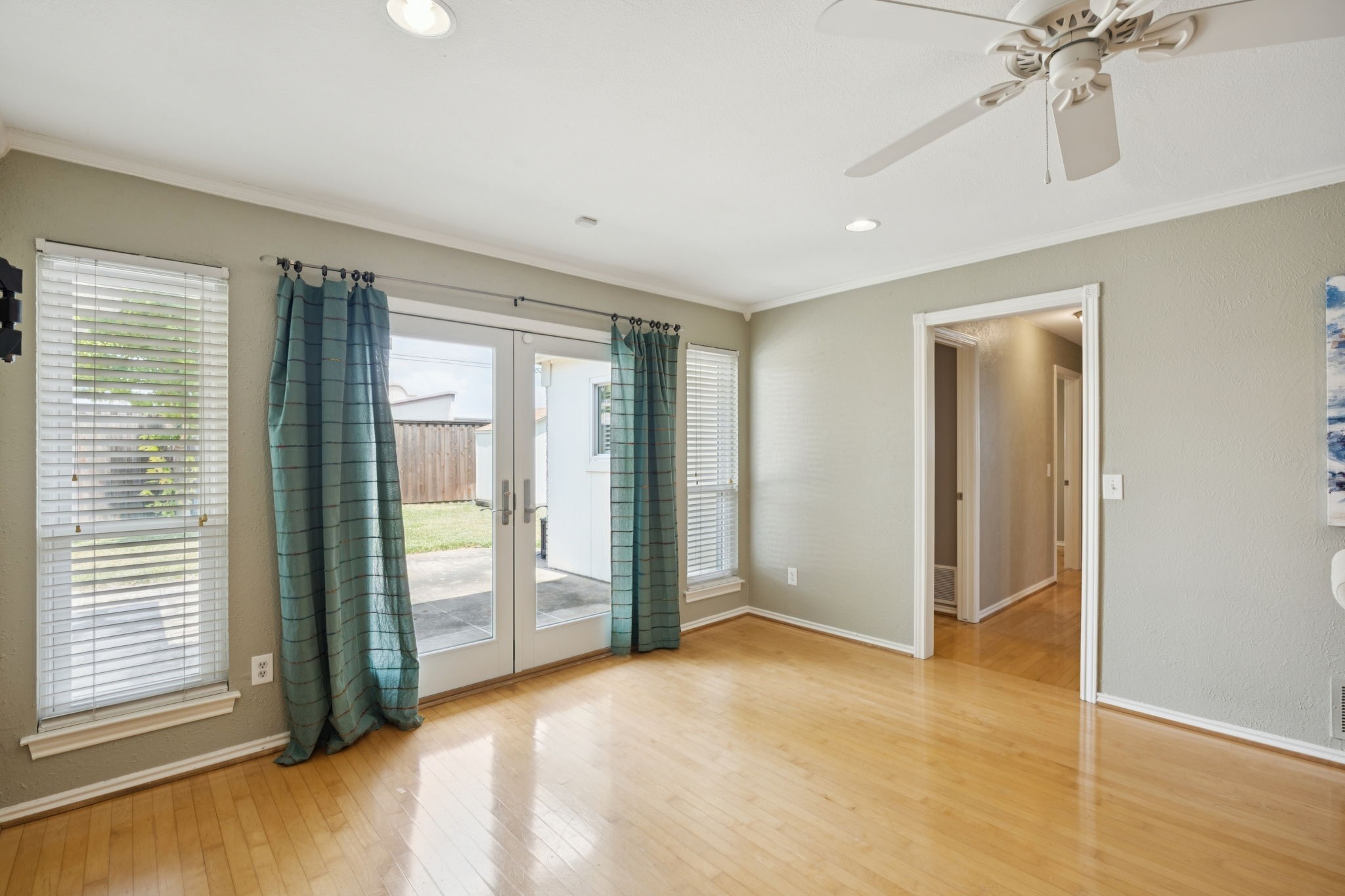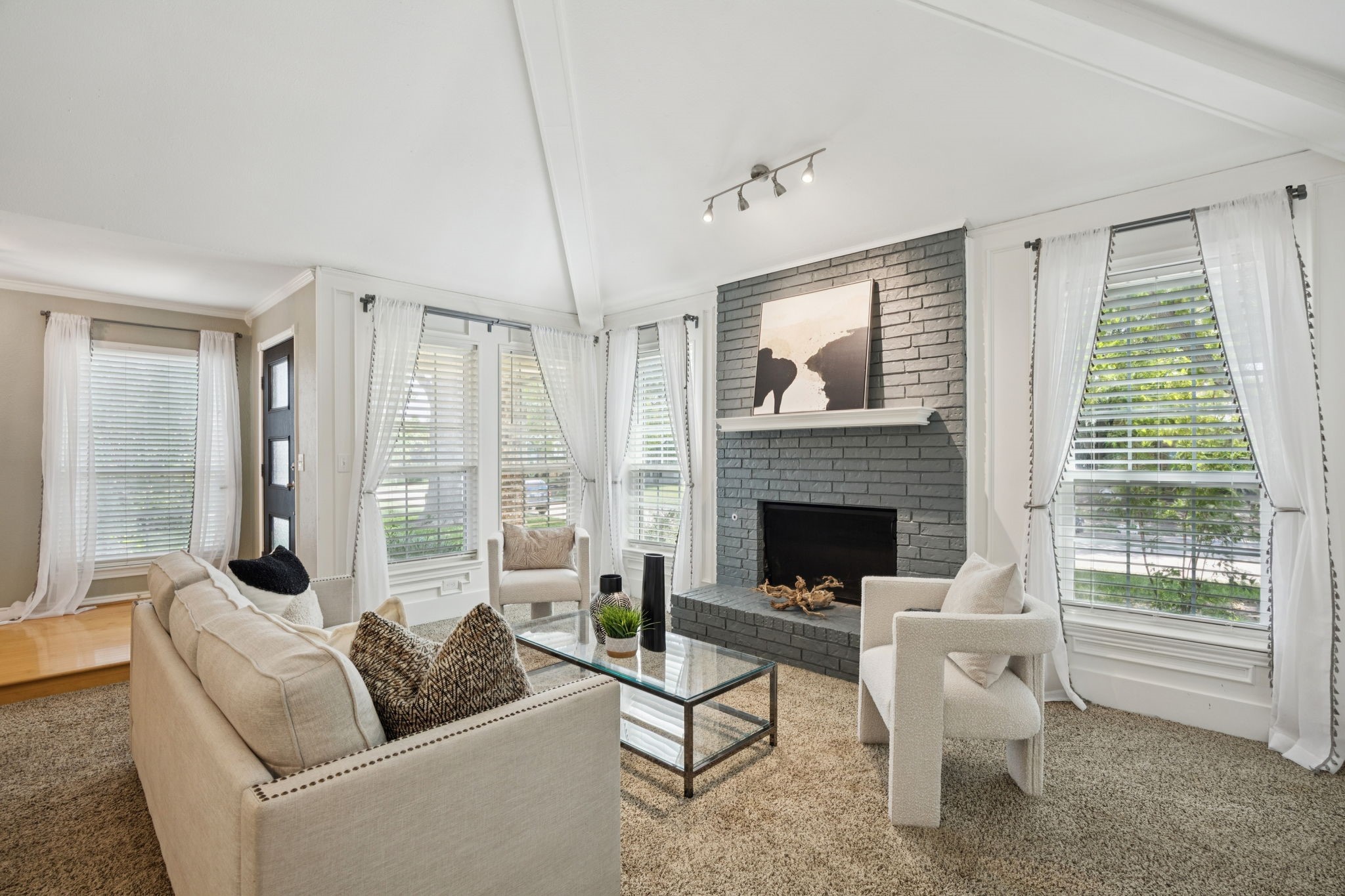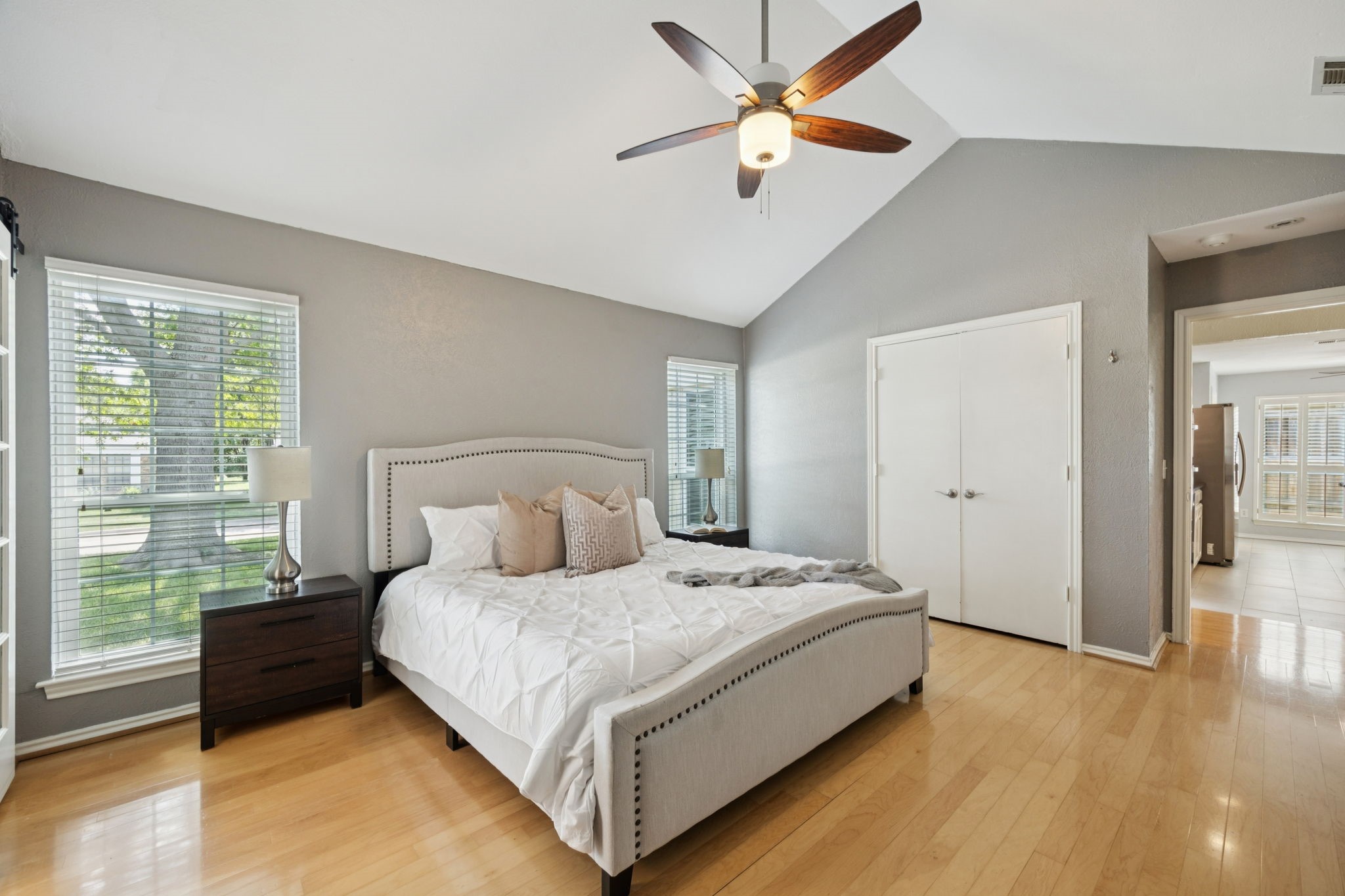 The private primary suite offers dual closets and an updated bath with a large walk-in shower. Three additional bedrooms share a separate hallway for privacy, along with a full bath. Wood floors, neutral colors, and generous natural light give the home a warm, inviting feel.