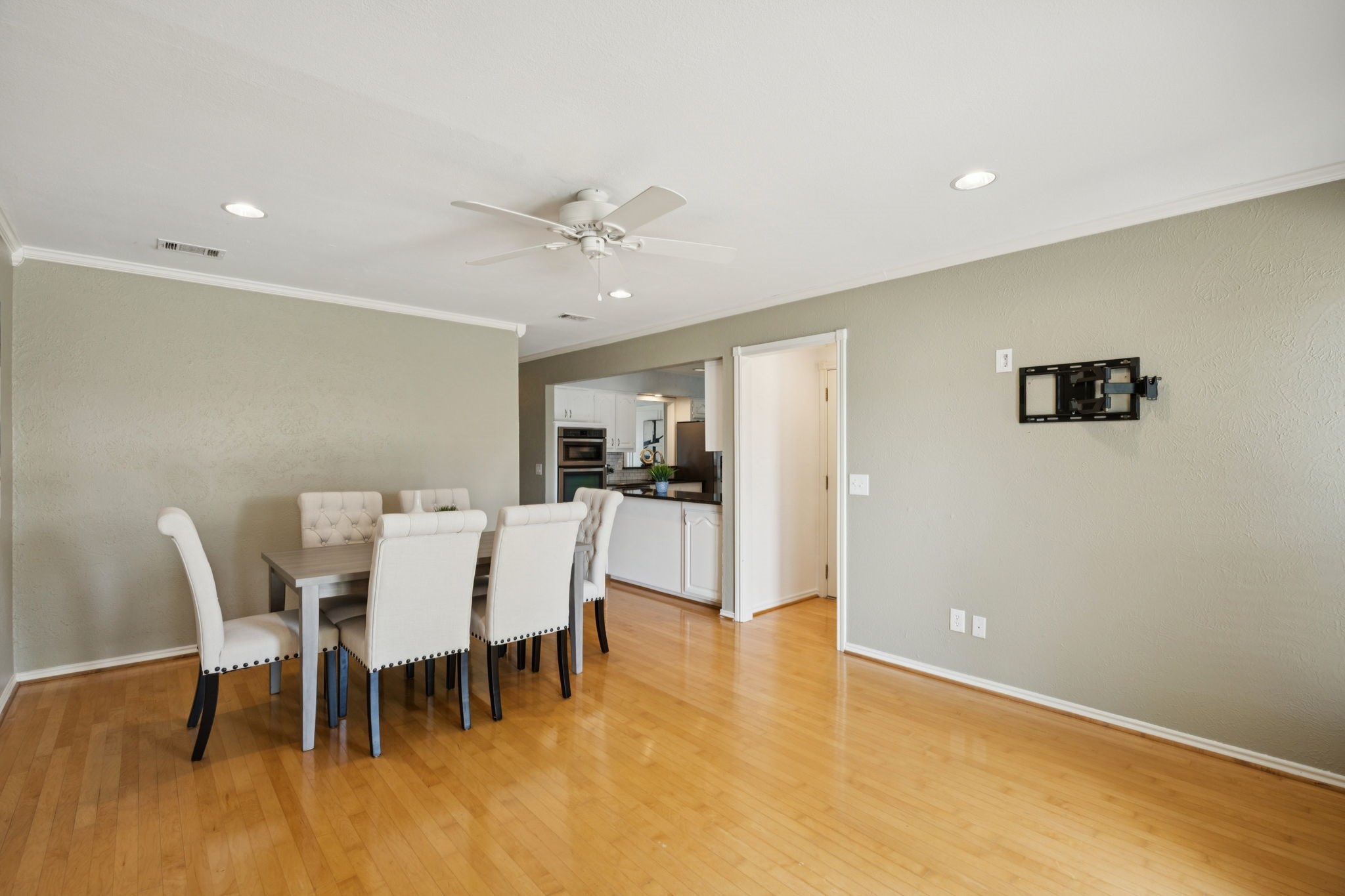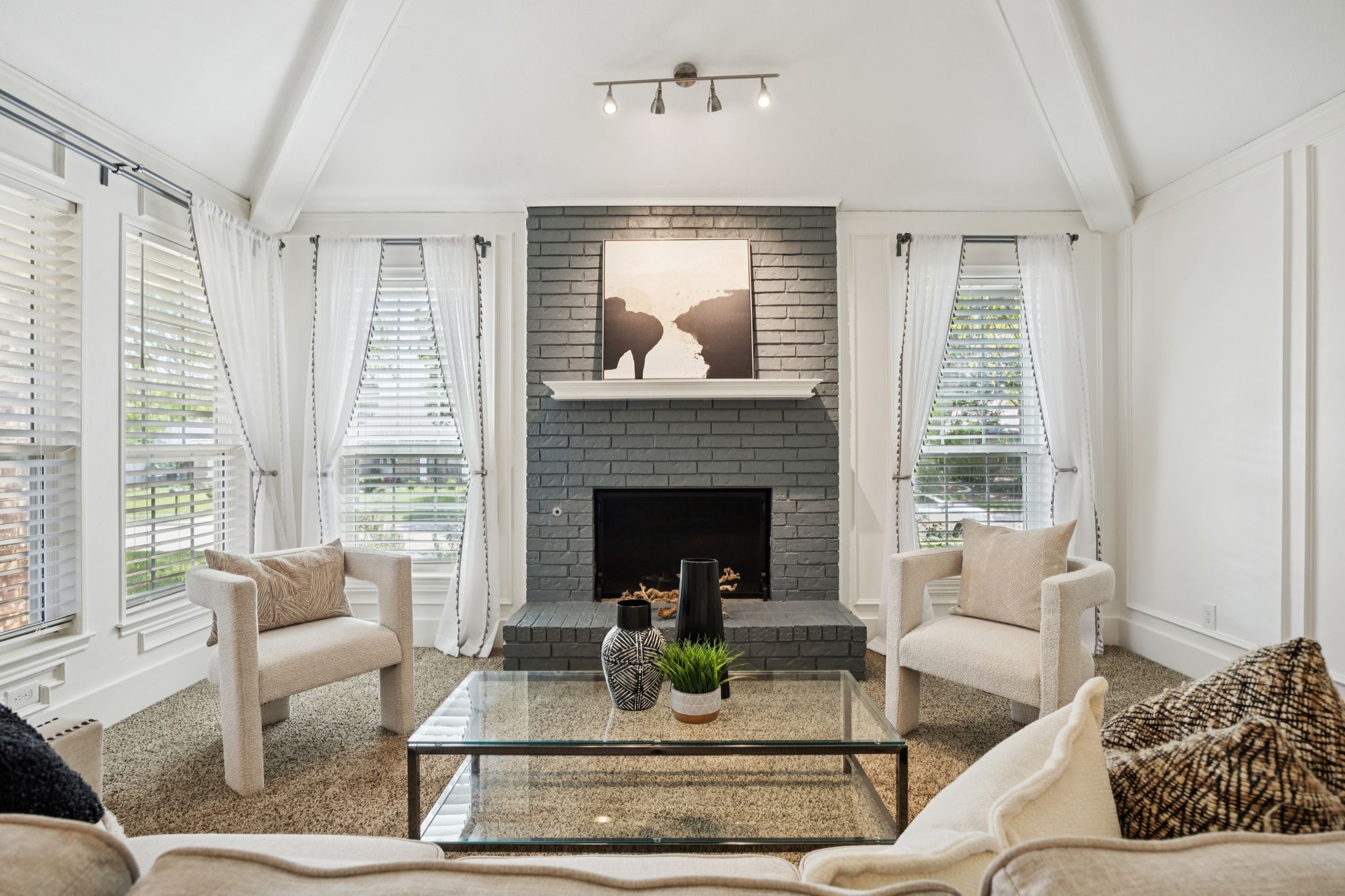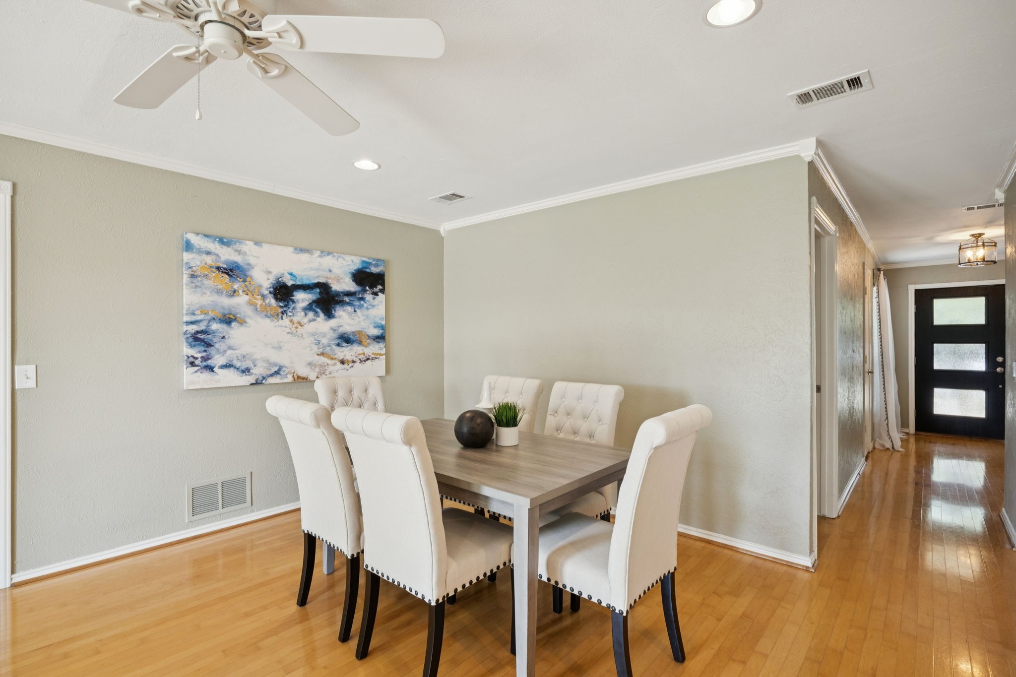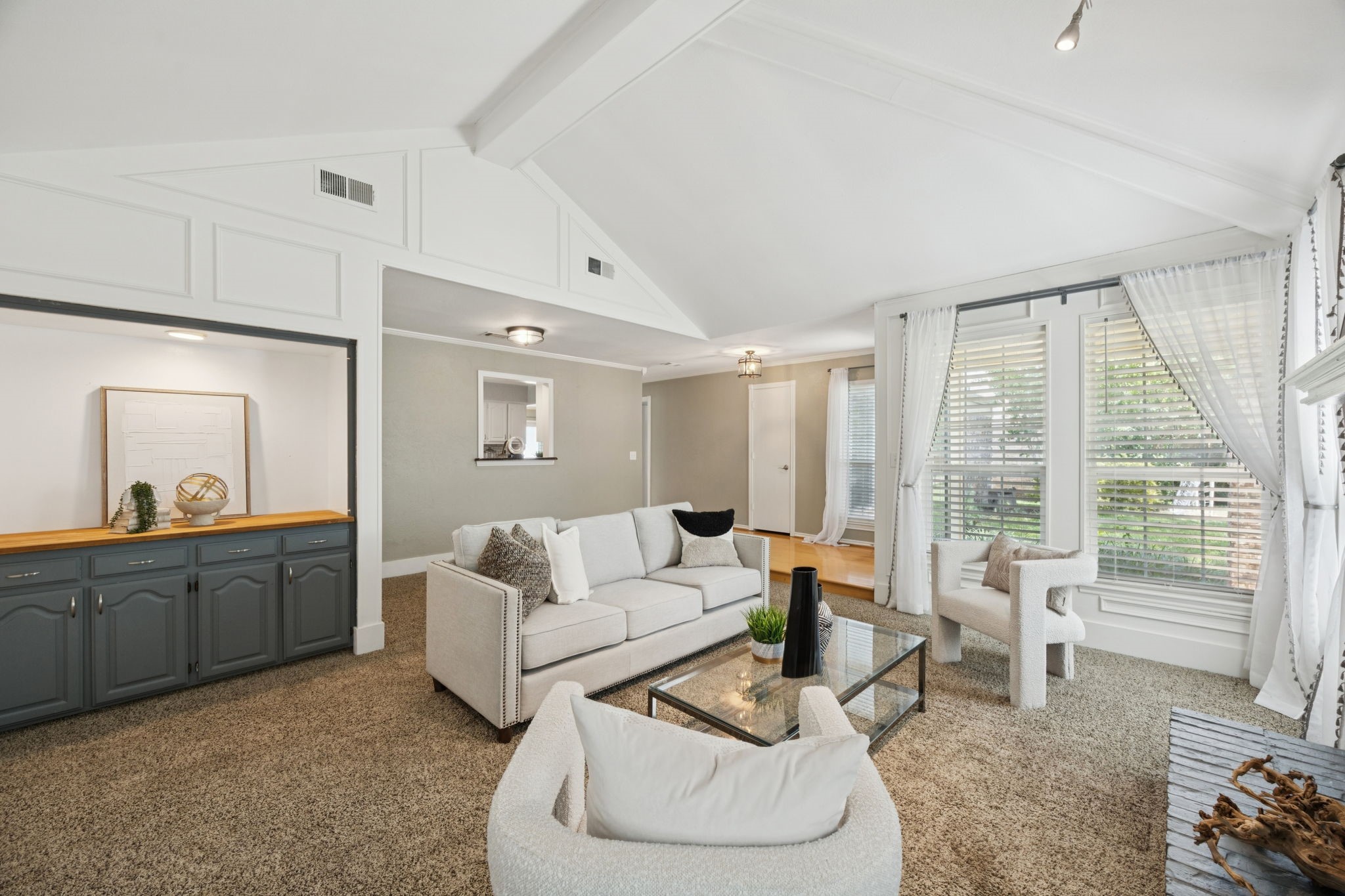 The private primary suite offers dual closets and an updated bath with a large walk-in shower. Three additional bedrooms share a separate hallway for privacy, along with a full bath. Wood floors, neutral colors, and generous natural light give the home a warm, inviting feel.