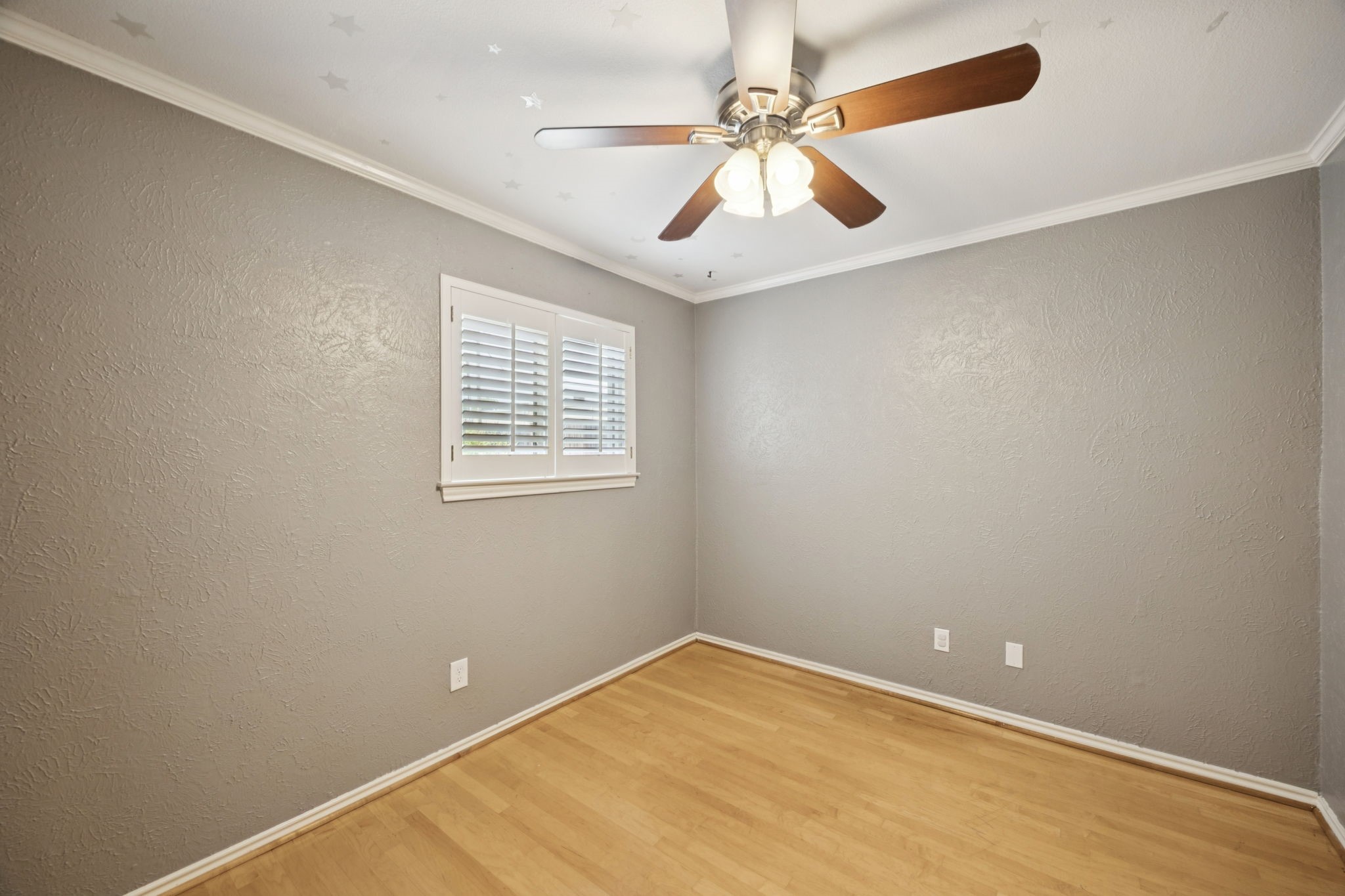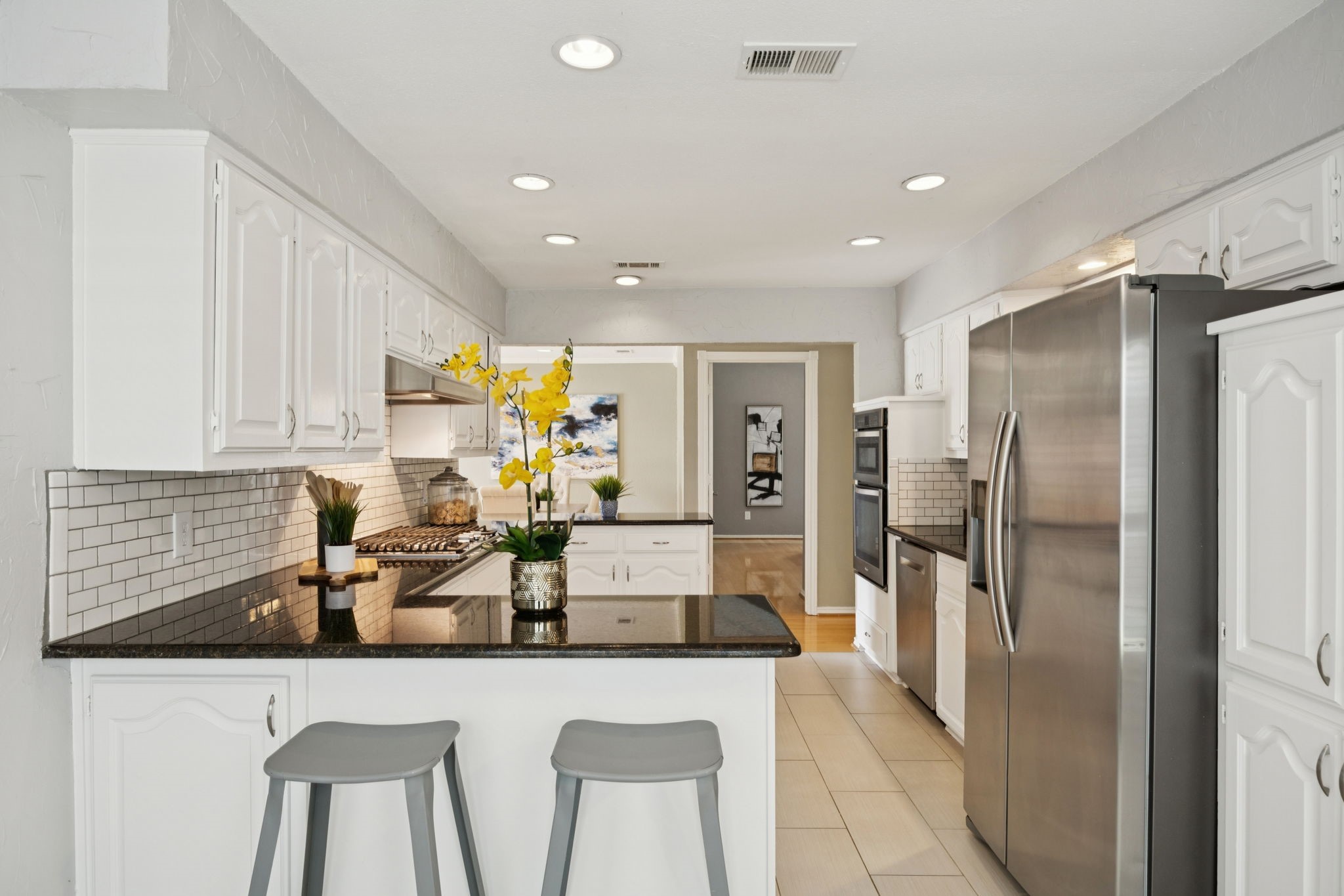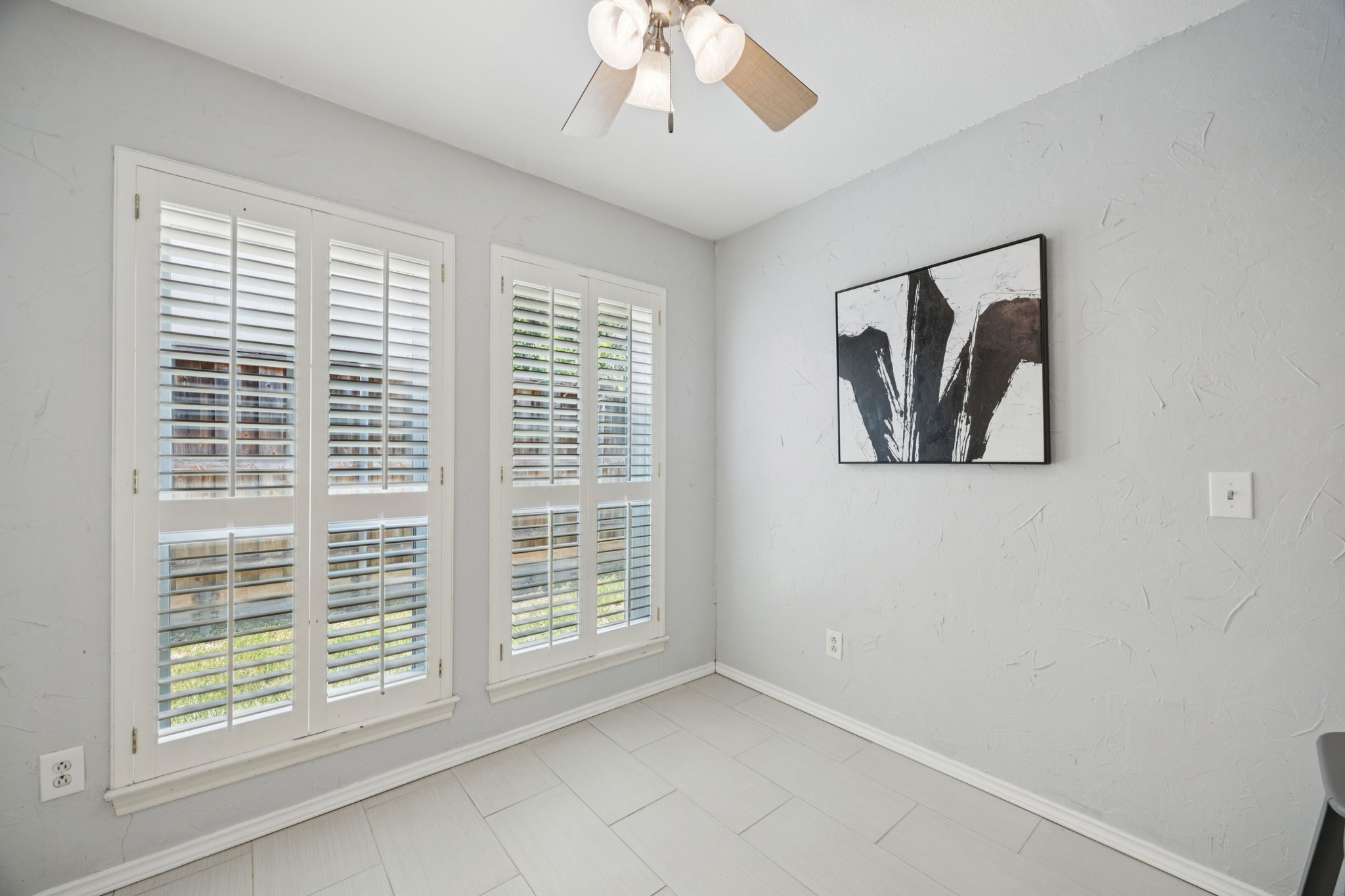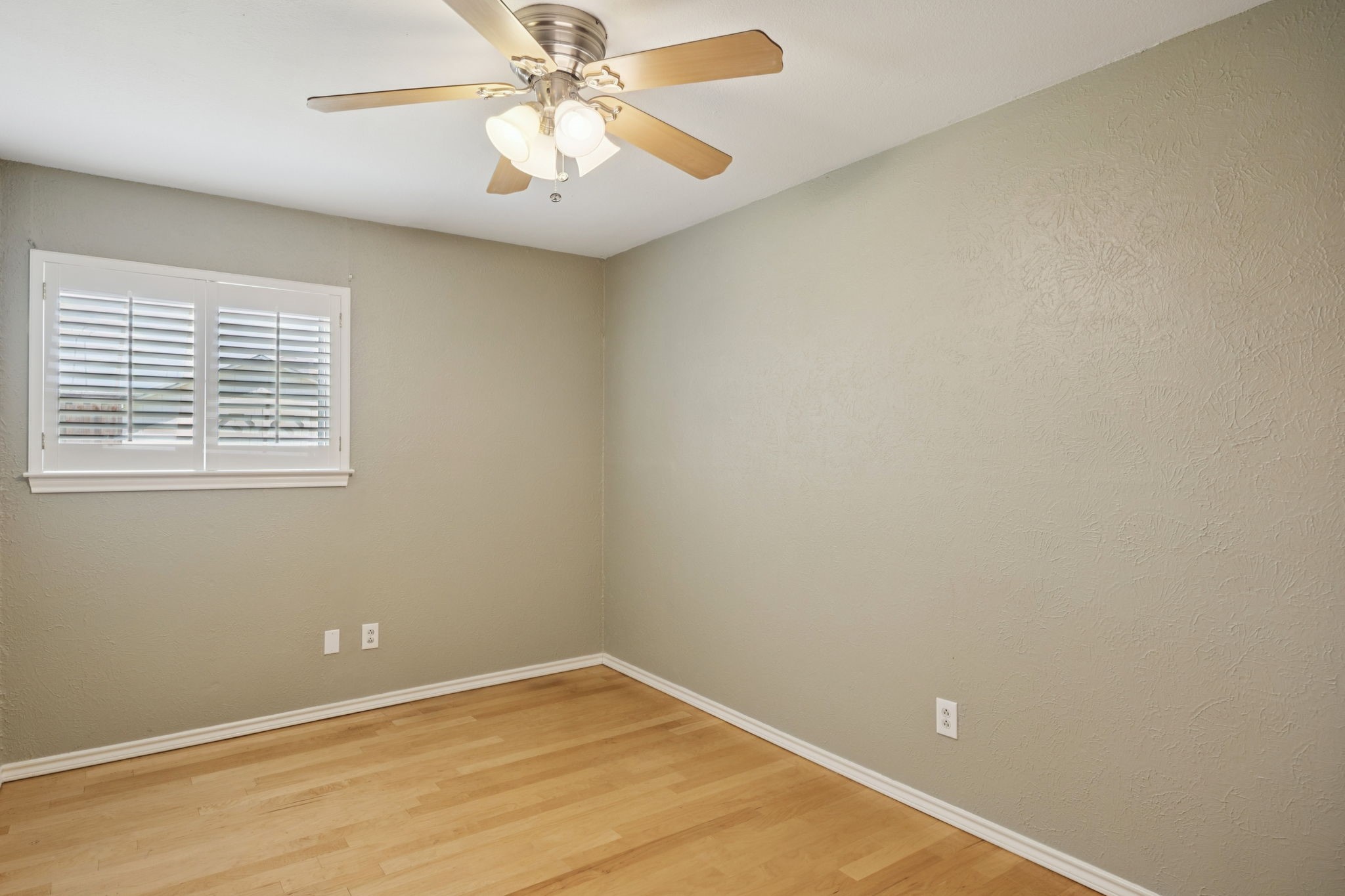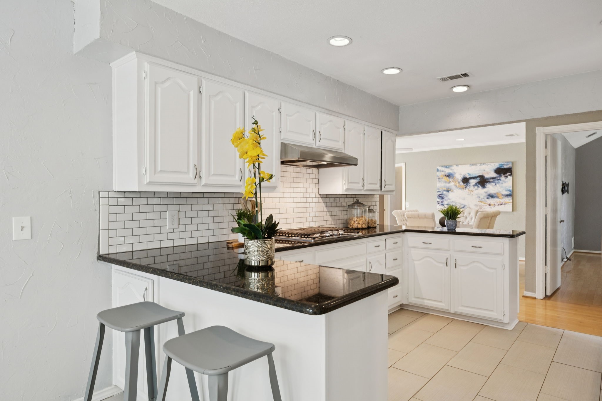 The private primary suite offers dual closets and an updated bath with a large walk-in shower. Three additional bedrooms share a separate hallway for privacy, along with a full bath. Wood floors, neutral colors, and generous natural light give the home a warm, inviting feel.