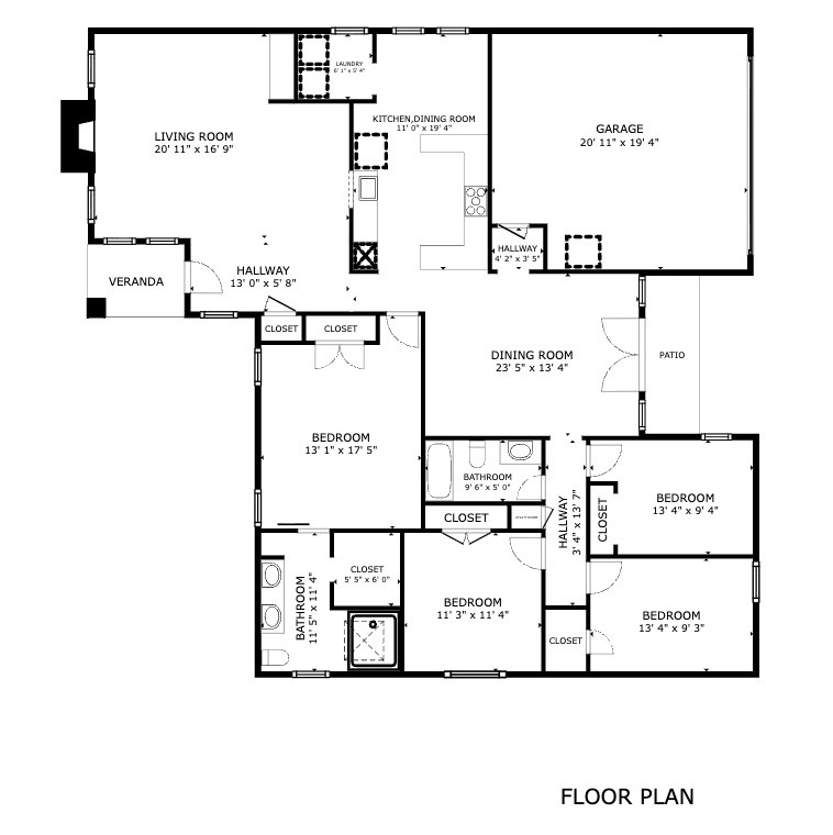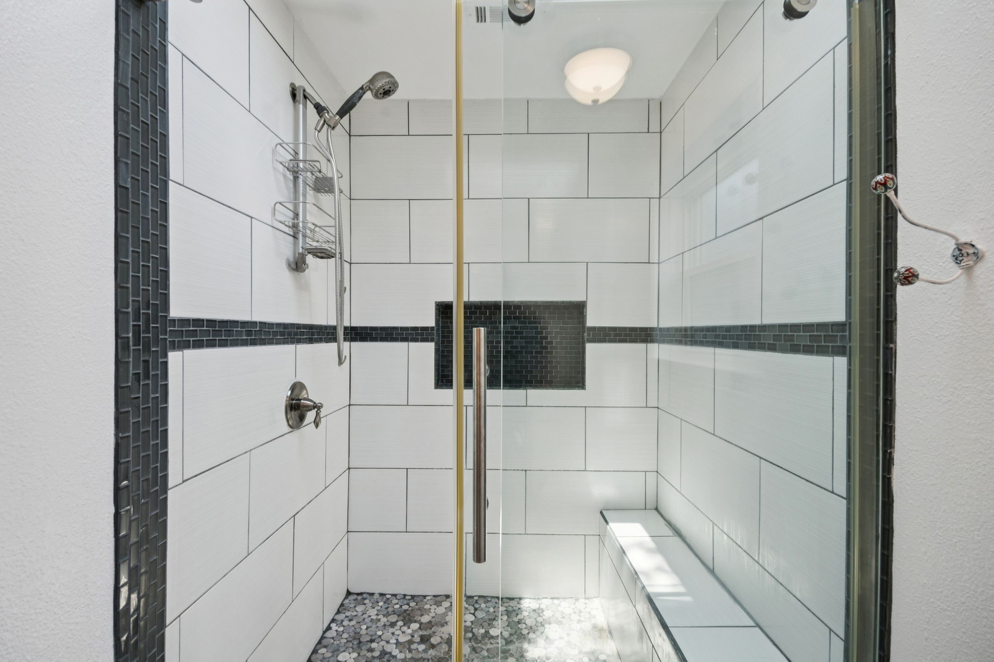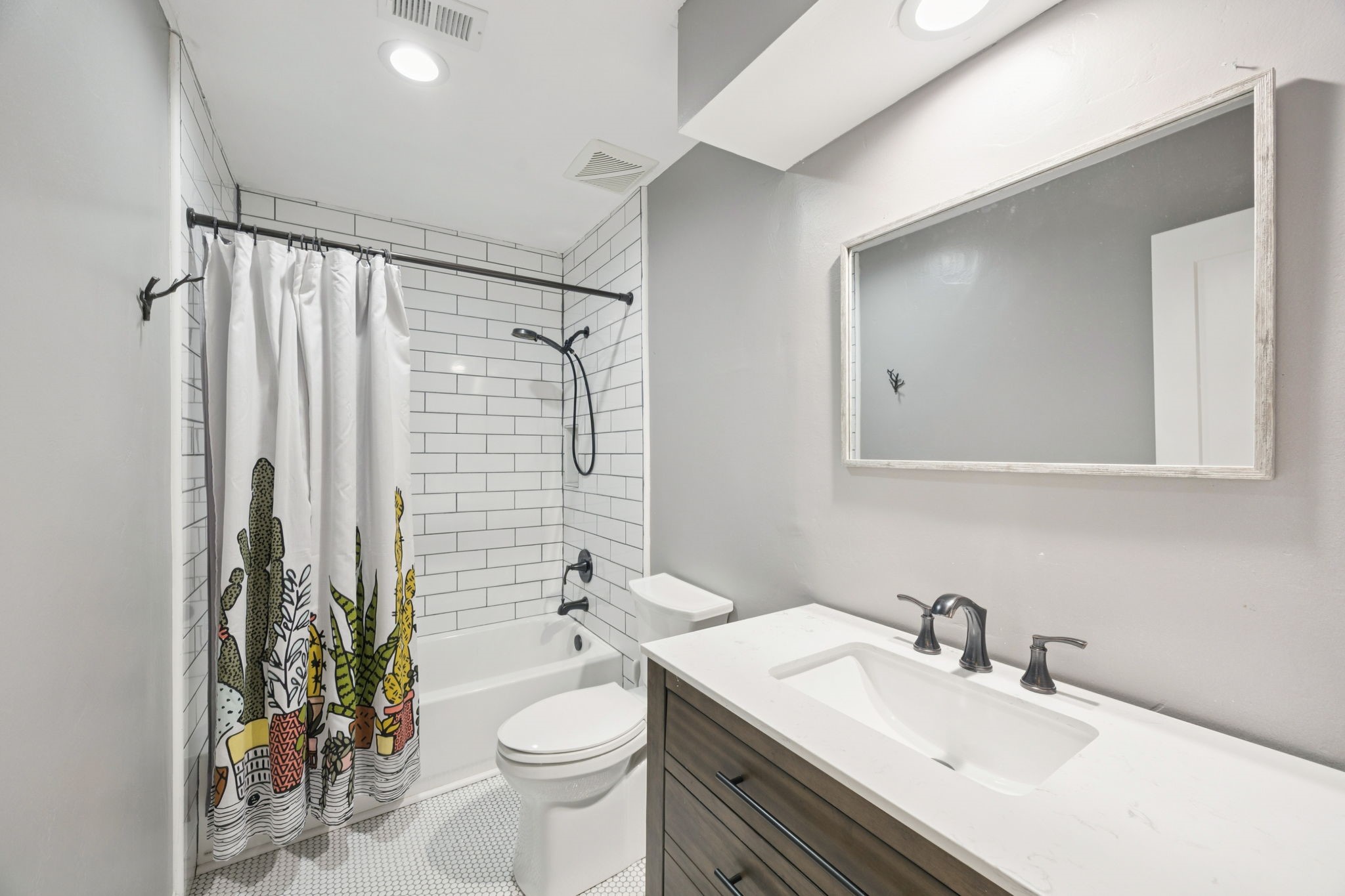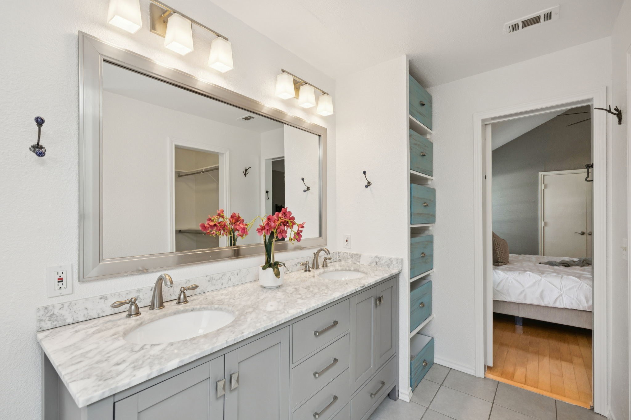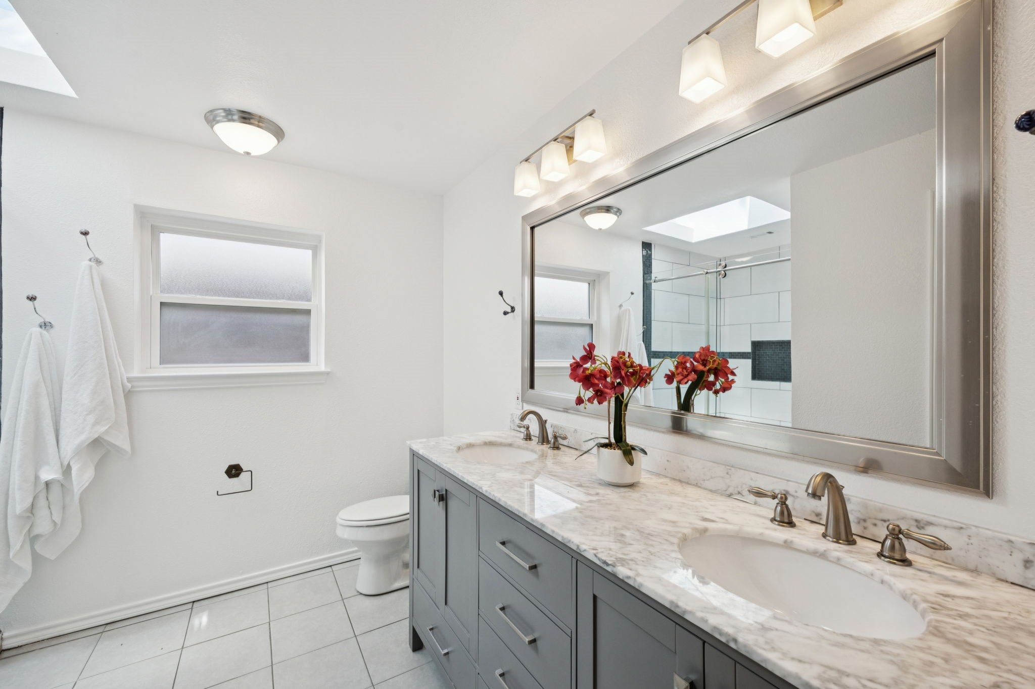The private primary suite offers dual closets and an updated bath with a large walk-in shower. Three additional bedrooms share a separate hallway for privacy, along with a full bath. Wood floors, neutral colors, and generous natural light give the home a warm, inviting feel.
