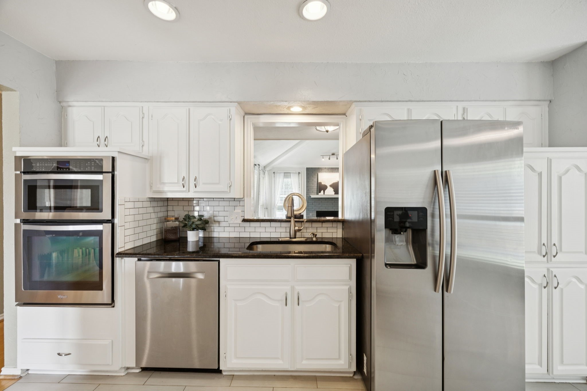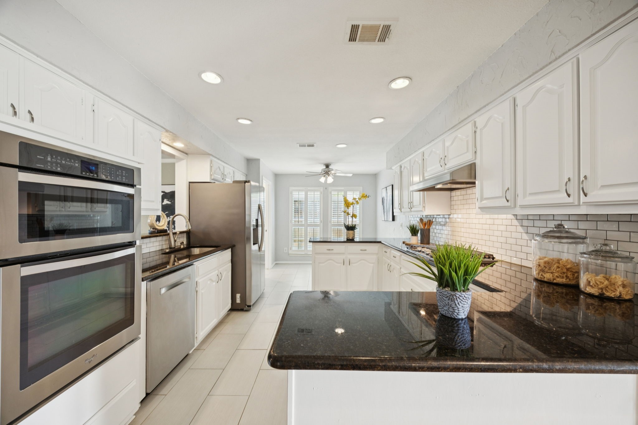 Inside, a bright and flexible floor plan offers multiple living and dining spaces, perfect for entertaining or cozy nights in. The main living room features a brick fireplace, vaulted ceilings, and built-ins, while the den off the kitchen can double as a formal dining room, playroom, or home office. The kitchen boasts granite counters, a gas cooktop, and a breakfast bar that opens to the sunny breakfast nook.
