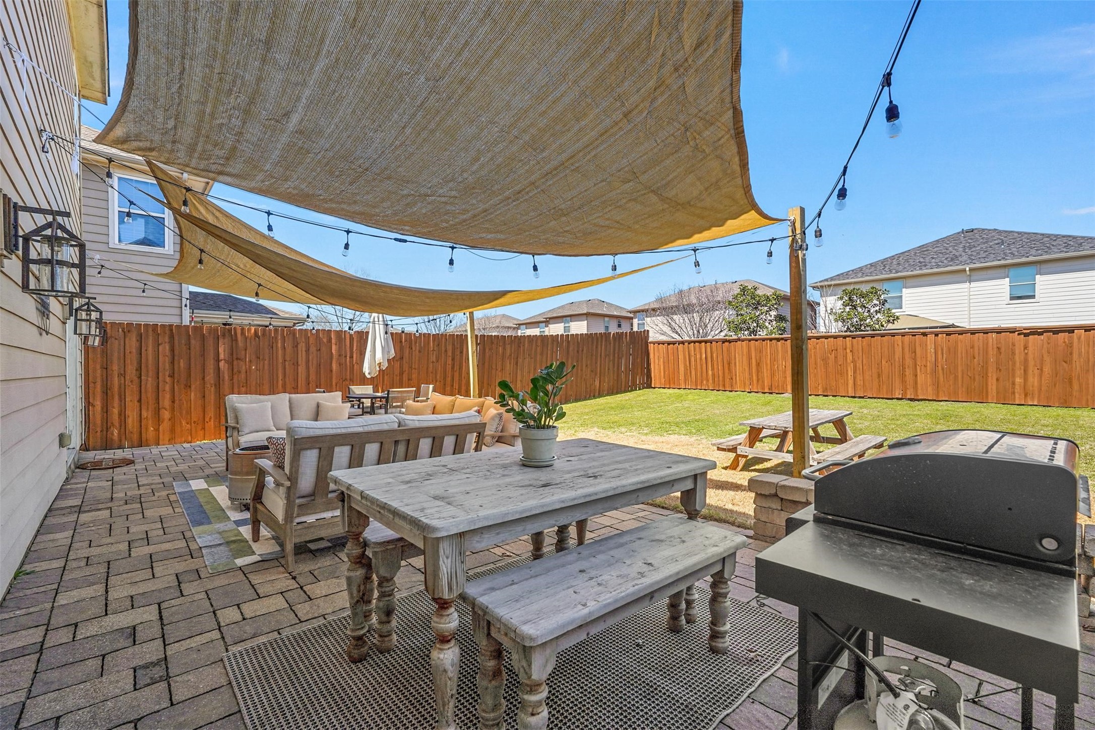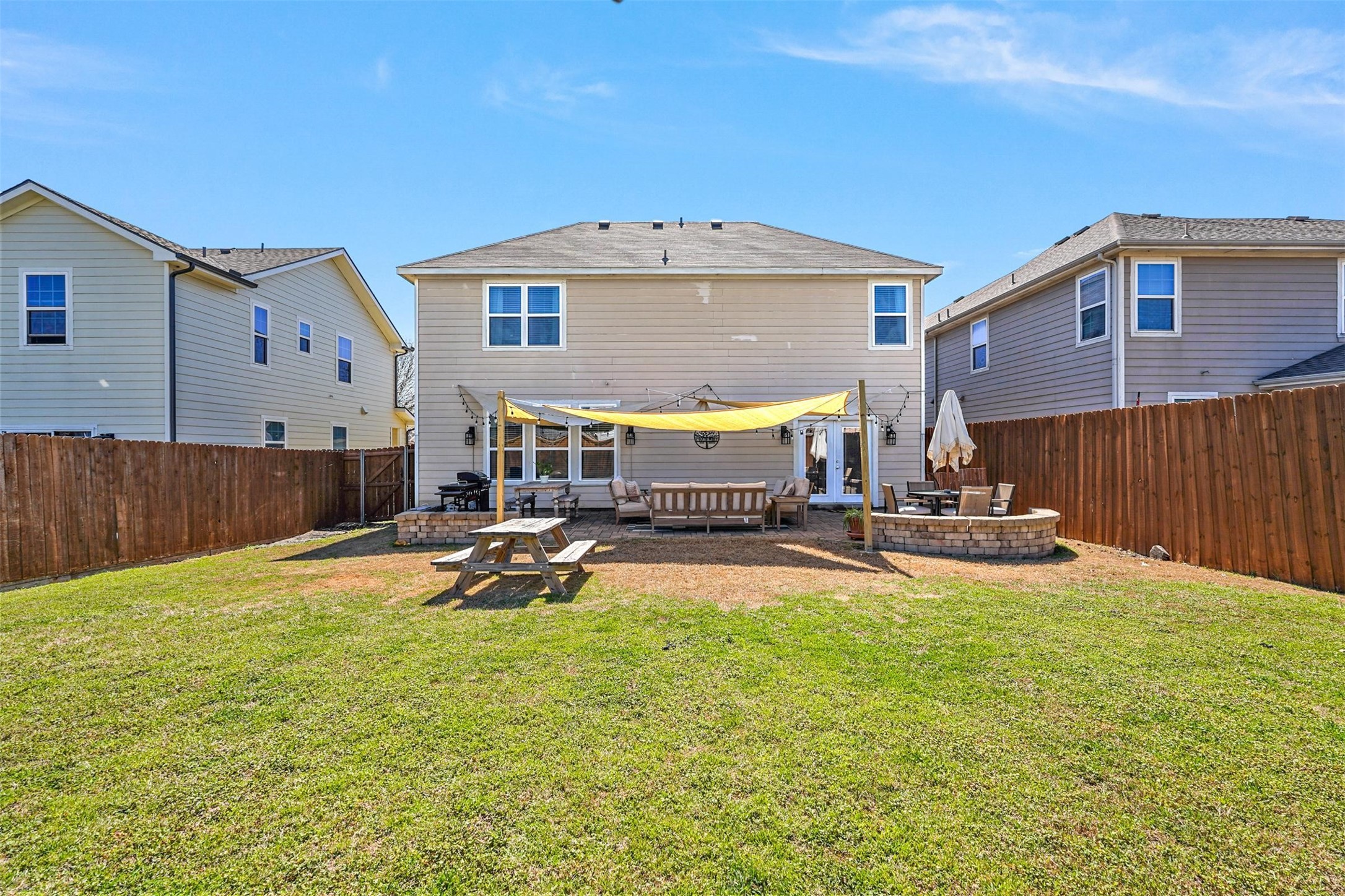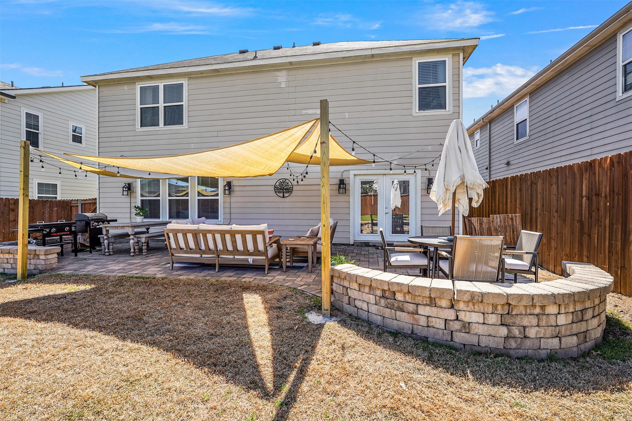 The backyard is an outdoor oasis, boasting a custom-designed 500 sq. ft. paver patio with built-in lighting, perfect for evening gatherings or weekend barbecues. The neighborhood itself is packed with amenities, including a catch-and-release fishing pond, a playground, and easy access to major highways, the APEX Recreation Center, PSA Complex, and Gabe Nesbitt Park.