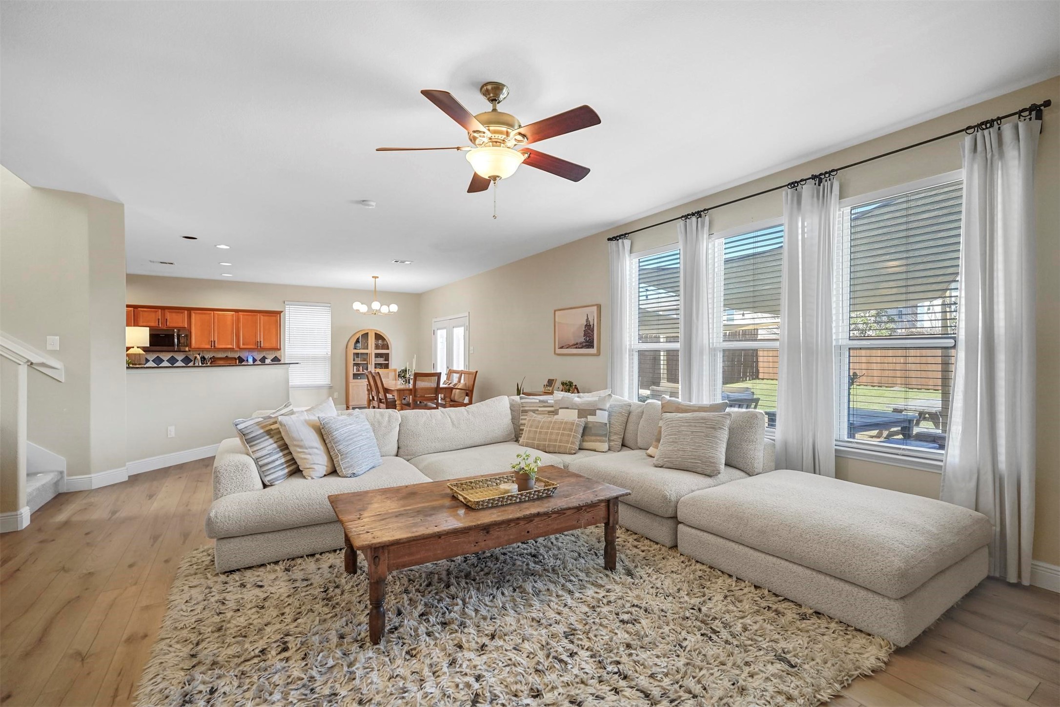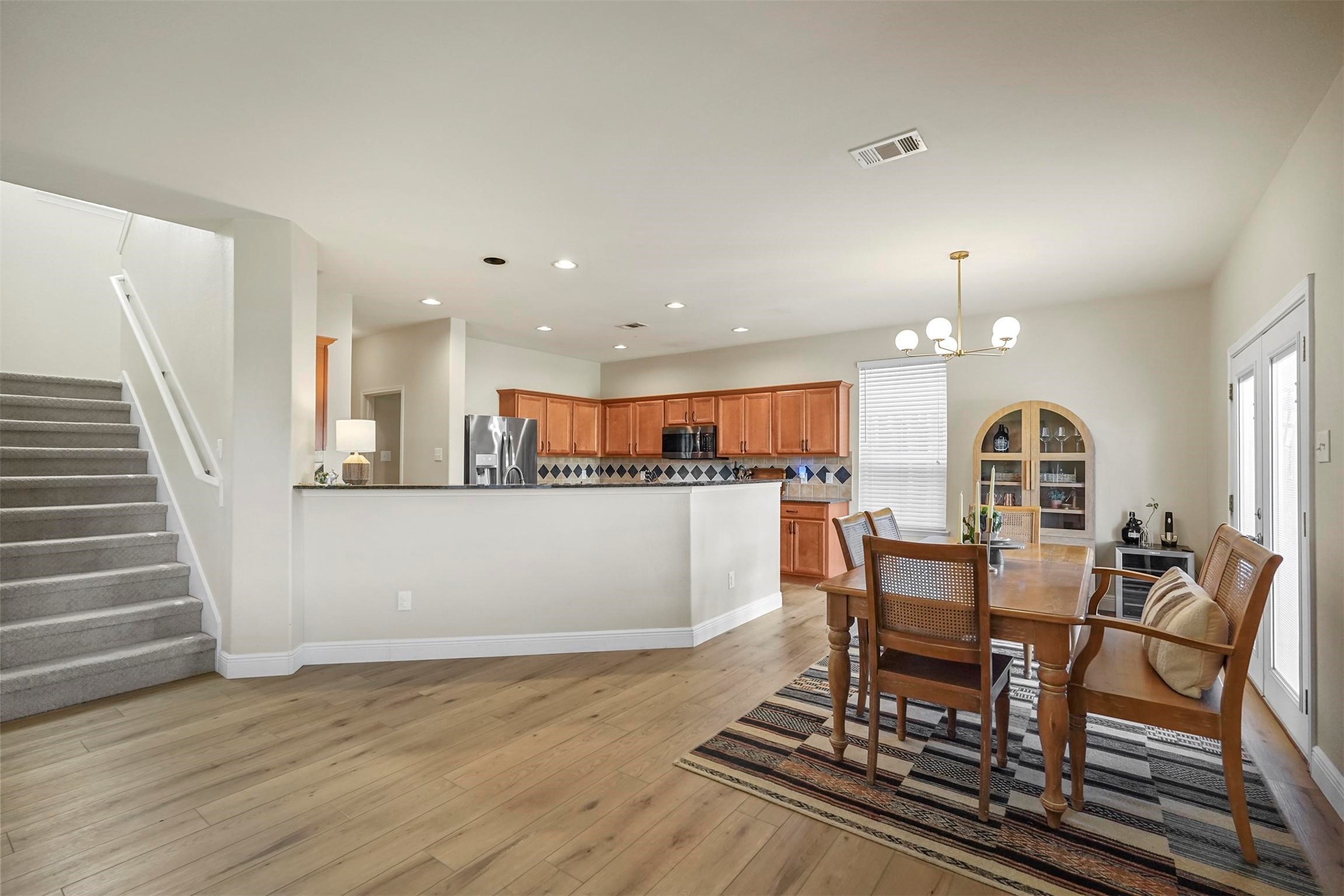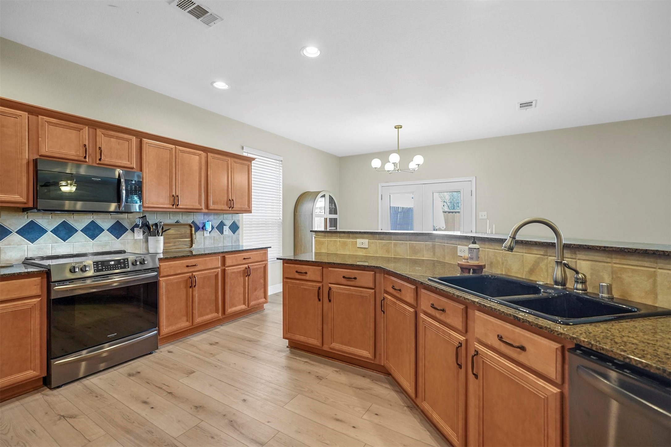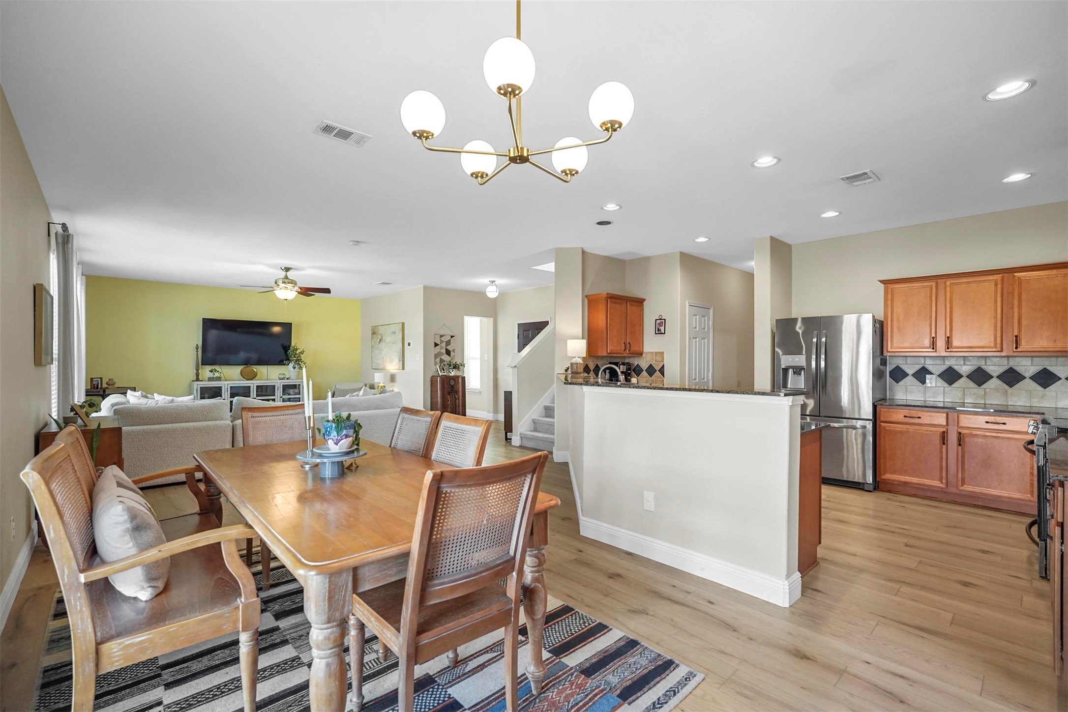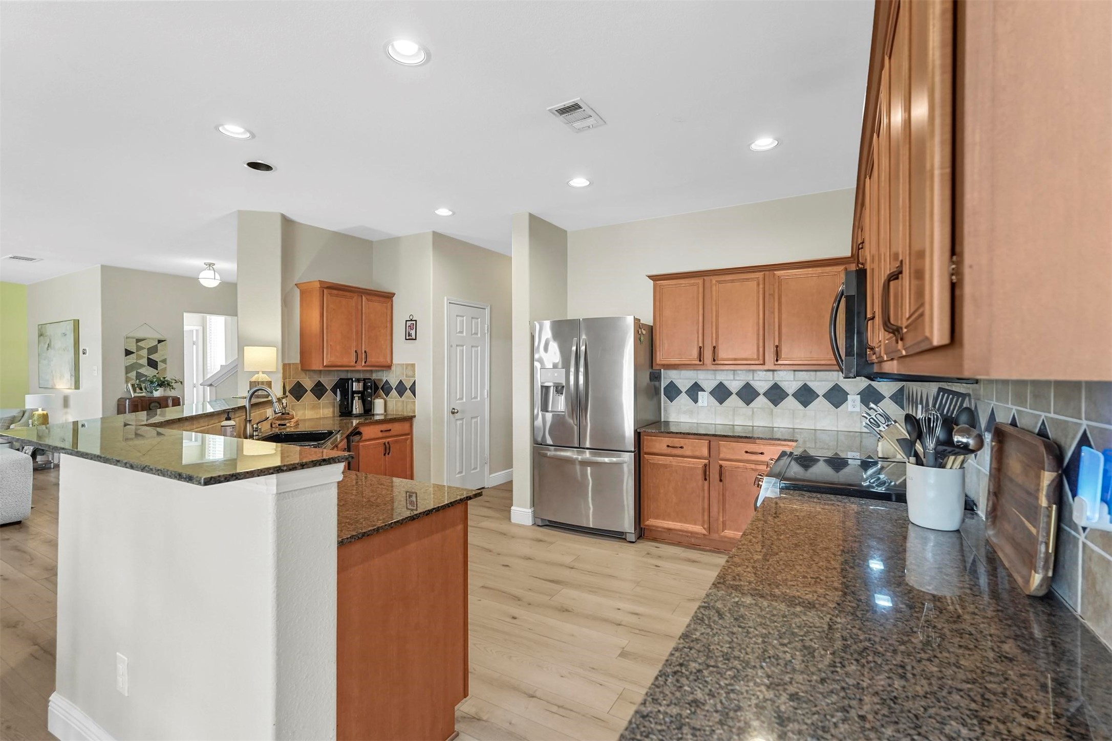 Step inside to discover a bright, open floor plan with recently added luxury vinyl plank (LVP) flooring, designed for both durability and style. The kitchen is a chef's dream, featuring granite countertops, a spacious walk-in pantry, and updated stainless steel appliances, including a microwave, oven with air fryer, and dishwasher. A large breakfast bar opens seamlessly to the dining and family room, creating an inviting space perfect for entertaining.