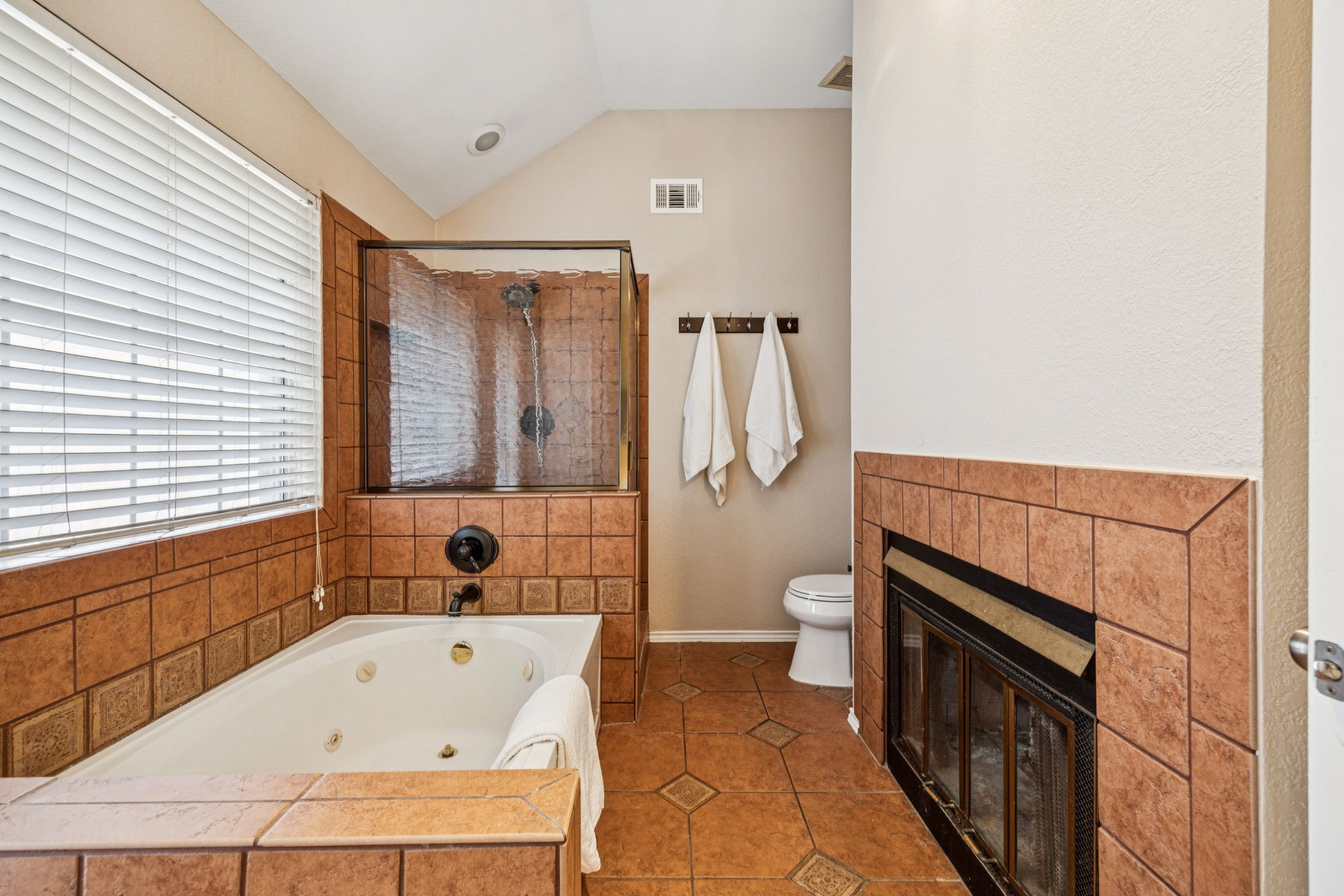 Fireplace: Bath, Double Sided, Living Room, Wood Burning